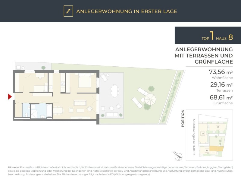Anlegerwohnung: Krems, Altstadt, Neubau: 3 Zimmer, 73 m² Wfl., 2 Terrassen, Grünfläche