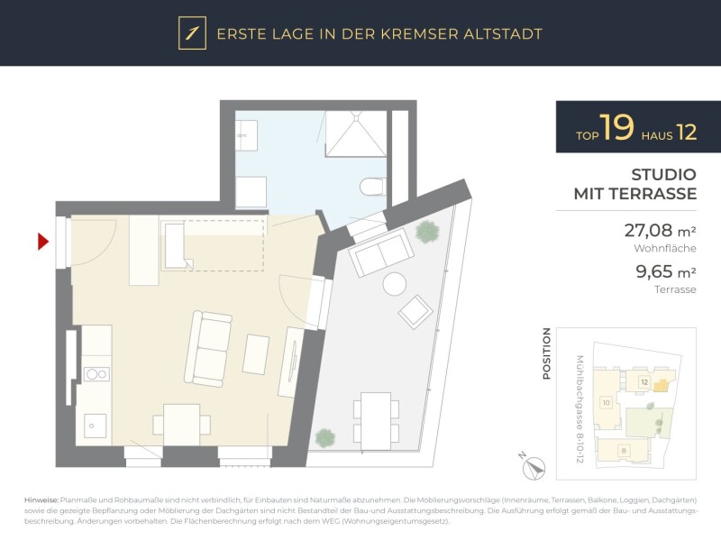 Krems, Altstadt, Neubau, Erstbezug: Studio, 1 Zimmer, 31m² Wfl., 13m² Terrasse, H12/T15