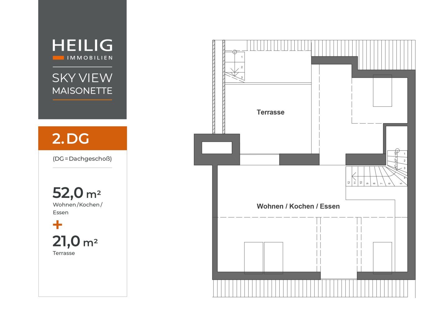 Über eine Treppe gelangt man auf die obere Wohnebene, die durch ihren offenen, hellen Wohn- und Essbereich mit integrierter Küche besticht. Der direkte Zugang zur ersten Dachterrasse schafft einen erweiterten Wohnraum im Freien – ideal zum Essen, Entspannen oder Sonnen. Eine Außentreppe führt weiter auf die zweite, höher gelegene Terrasse, die mit freiem Himmel und einem beeindruckenden 360°-Blick über Wien eine besondere Qualität bietet.