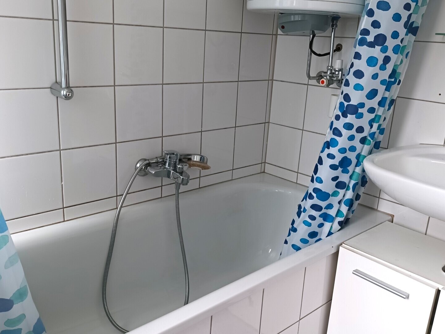 Badezimmer mit Badewanne und Waschmaschinenanschluss.