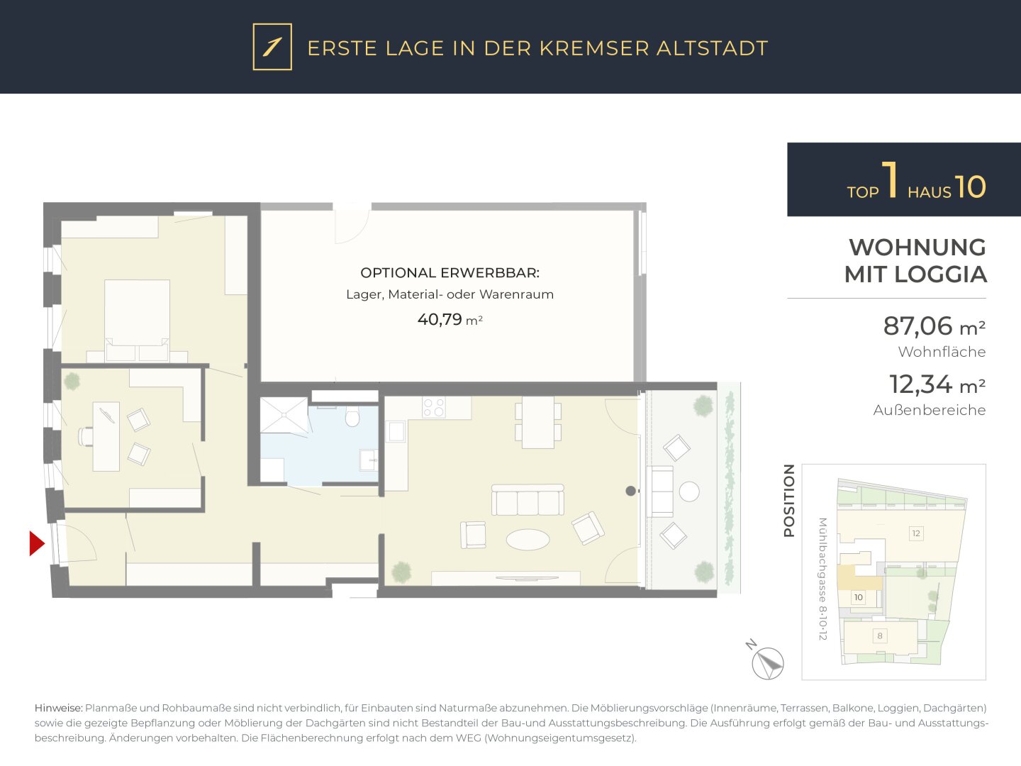 Ein besonderer Mehrwert ergibt sich durch die Möglichkeit, einen separaten und angrenzenden Abstell- bzw. Lagerraum mit rund 40 m² zusätzlich zu erwerben (Kaufpreis € 80.000,–). Der Raum befindet sich nur wenige Schritte entfernt und eignet sich ideal als:
