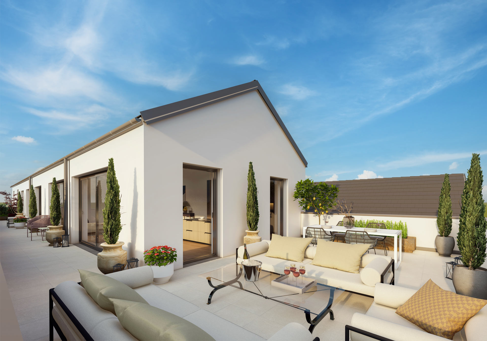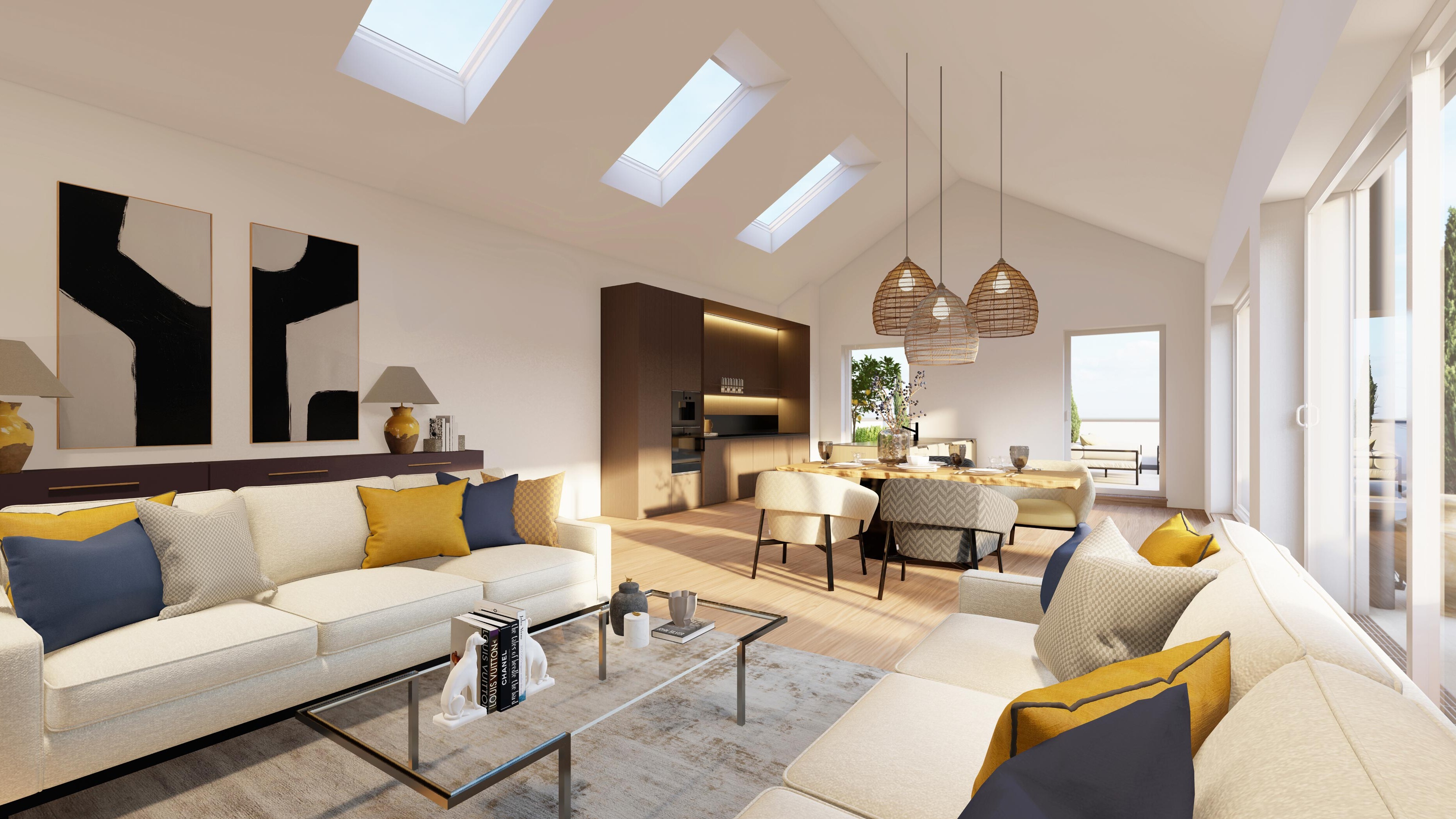 Diese Penthouse-Wohnung überzeugt durch ihre besondere Architektur und ein Wohngefühl, das im Neubau selten zu finden ist. Der großzügige Wohn-, Koch- und Essbereich mit beeindruckender Raumhöhe und markanter Giebeldecke schafft eine offene, fast kathedralartige Atmosphäre. Große Glasflächen und Dachflächenfenster sorgen für viel Tageslicht und lassen den Innenraum hell und lebendig wirken. Gleichzeitig entstehen spannende Blickachsen, die den Raum zusätzlich öffnen und seine architektonische Qualität unterstreichen. Die Kombination aus Höhe, Licht und Offenheit schafft ein Wohnambiente, das Weite und Geborgenheit zugleich vermittelt. So entsteht ein Wohnraum, der Weite, Helligkeit und architektonische Qualität auf einzigartige Weise verbindet.
