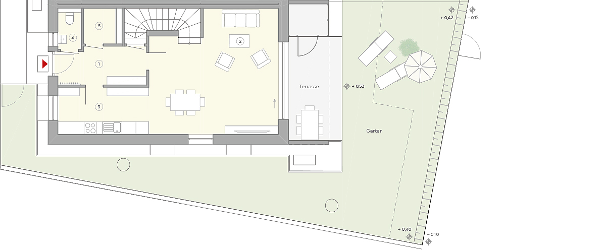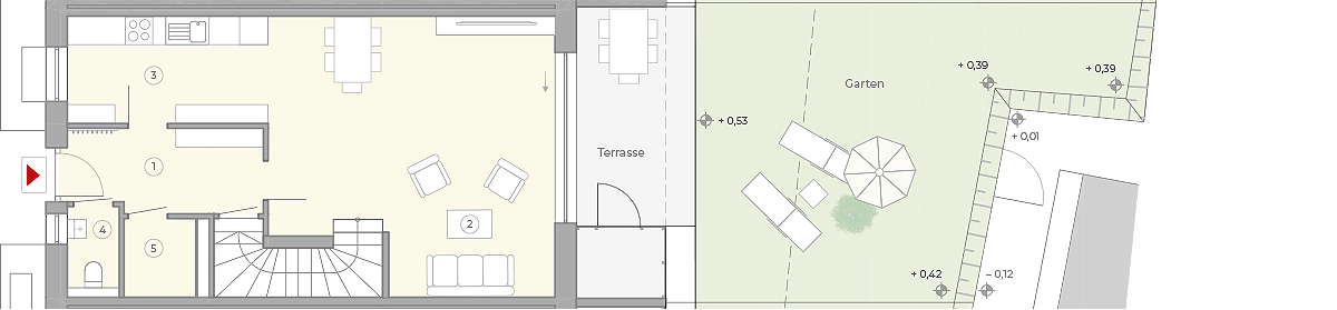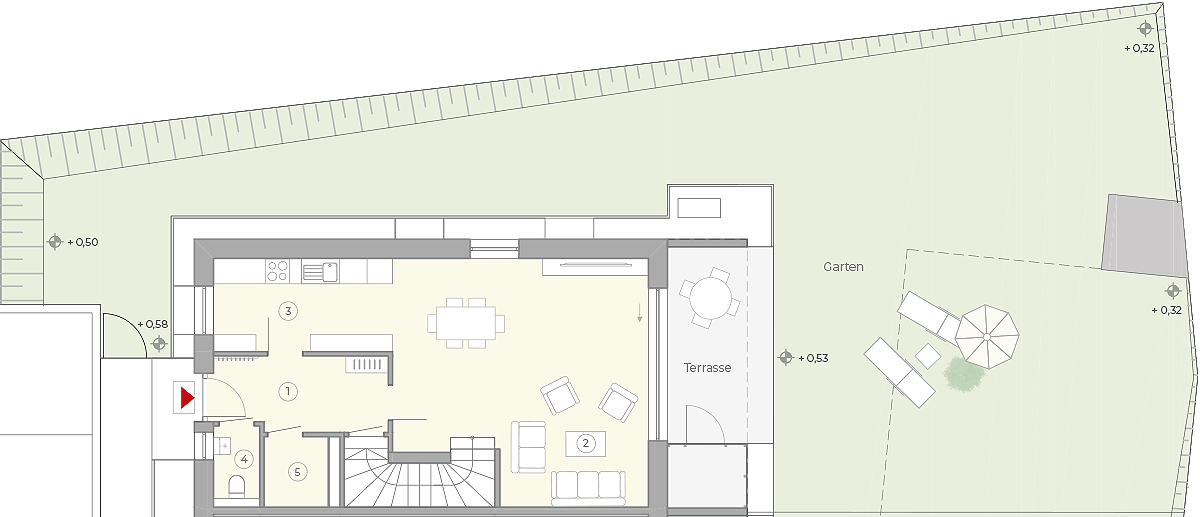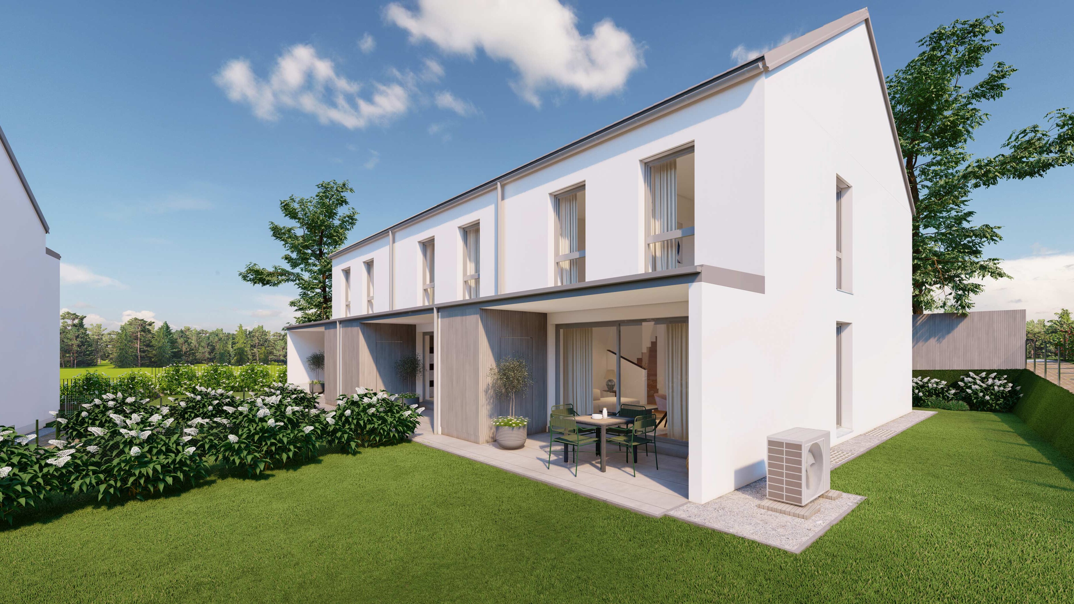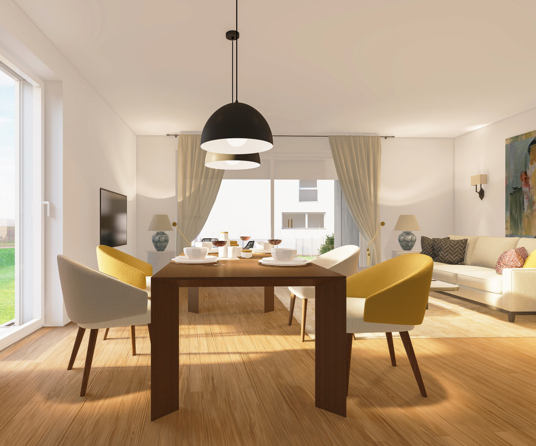 Die Reihenhäuser bieten ein Wohngefühl, das dem eines klassischen Einfamilienhauses sehr nahekommt. Auf zwei Ebenen entstehen klar strukturierte Wohnbereiche mit ausreichend Platz für Familien, Paare oder für Wohnen und Arbeiten unter einem Dach. Der offene Wohn-, Koch- und Essbereich im Erdgeschoß bildet den Mittelpunkt des Hauses und öffnet sich zur Terrasse und in den privaten Garten. Diese direkte Verbindung von Innen- und Außenraum schafft eine angenehme Wohnatmosphäre mit viel Freiraum. Ein großer Kellerbereich ergänzt das Wohnkonzept und bietet viel Platz für Stauraum, Hobbyraum oder sogar einen kleinen Fitnessbereich – so wird das Reihenhaus noch flexibler nutzbar und passt sich den individuellen Bedürfnissen seiner Bewohner an.