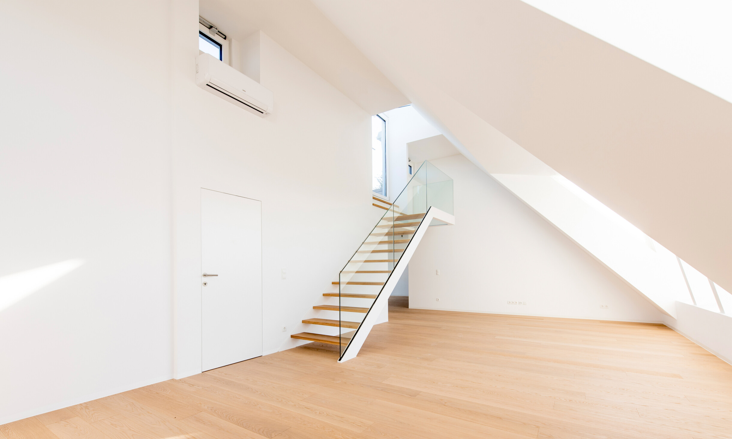 Die Ausstattung und Materialwahl erfolgte auf hohem Niveau. Komplettiert wurde das Wohnprogramm durch individuelle Einlagerungsräume im Kellergeschoß sowie einen Fahrrad- und Kinderwagenabstellraum im Erdgeschoß. Die luxuriöse Penthouse-Wohnung bietet mit 148,8 m² Wohnfläche ein weitläufiges und exklusives Wohnareal. Hinzu kommt ein zum ruhigen Innenhof hin orientierter knapp 10 m² großer Balkon und eine mit 54 m² ausreichend dimensionierte Sky Bridge Dachterrasse, die vom Wohnsalon aus über eine Treppe zu erreichen ist. Der nach Westen ausgerichtete Wohnsalon mit Küche und Essbereich vermittelt mit 76 m² ein Gefühl von Freiheit und Offenheit, das durch die riesigen Glasflächen und der zum Teil beeindruckenden Raumhöhe noch verstärkt wird. 3 Schlafräume und 2 Bäder bieten bis zu 6 Personen Platz. Das Penthouse verfügt über einen eigenen privaten Liftzugang und eine Loxone Smart Home Steuerung für Heizung, Klima, Beschattung und Licht.